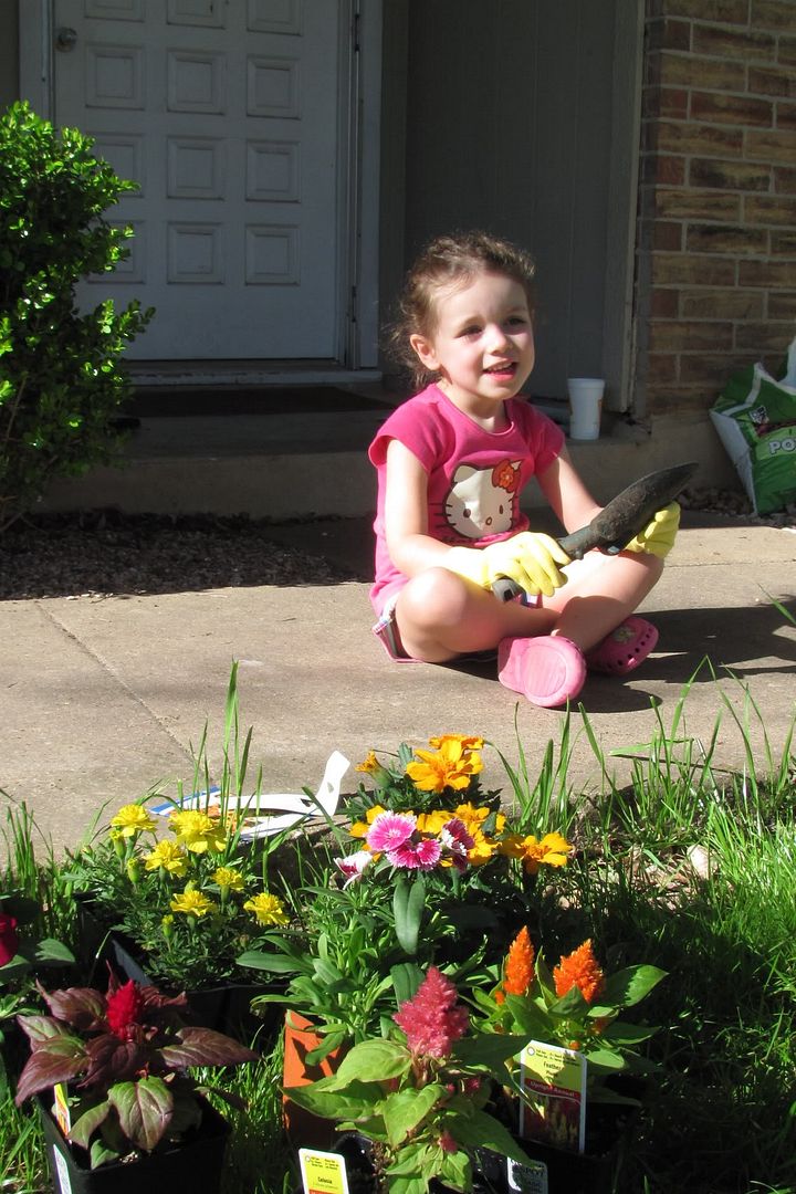 That afternoon we went to Lowes to pick up some flowers, seeds and potting soil, and managed to sneak in some yellow kids sized gardening gloves too. Havi had so much fun getting messy and planting the flowers and the seeds. Over the last week or so the seeds (in their Starbucks cups) have started sprouting and Havi is loving watching them pop up. Coincidentally it was 'flower' week at school and Havi planted a class plant there as well.