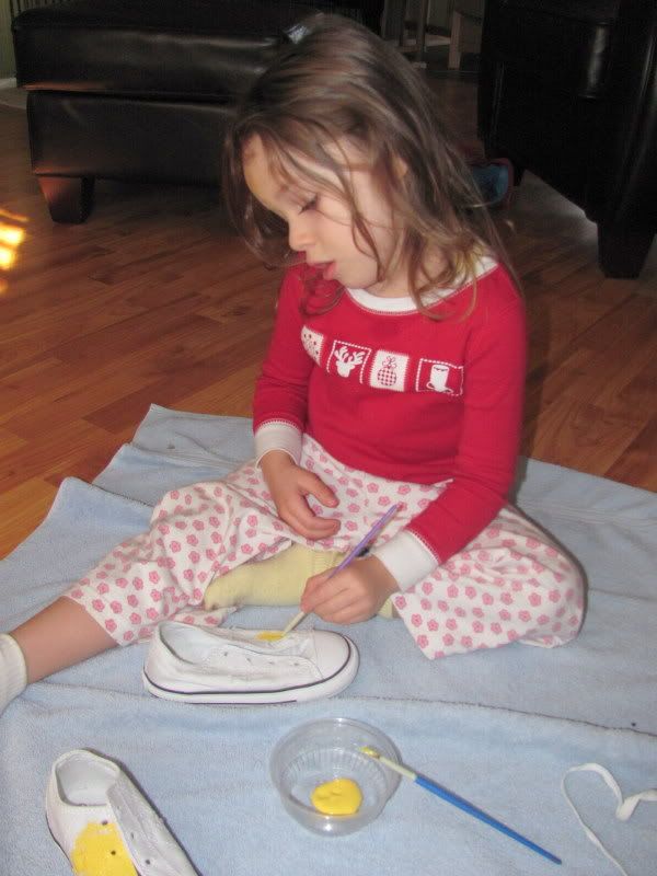 After a trip to the craft store we came back armed with yellow fabric paint, pink 'puffy' paint and sparkles. We had a fun time painted, gluing and being shoe designers and her new Lellow (that's not a typo) shoes were a hit at school on Monday.