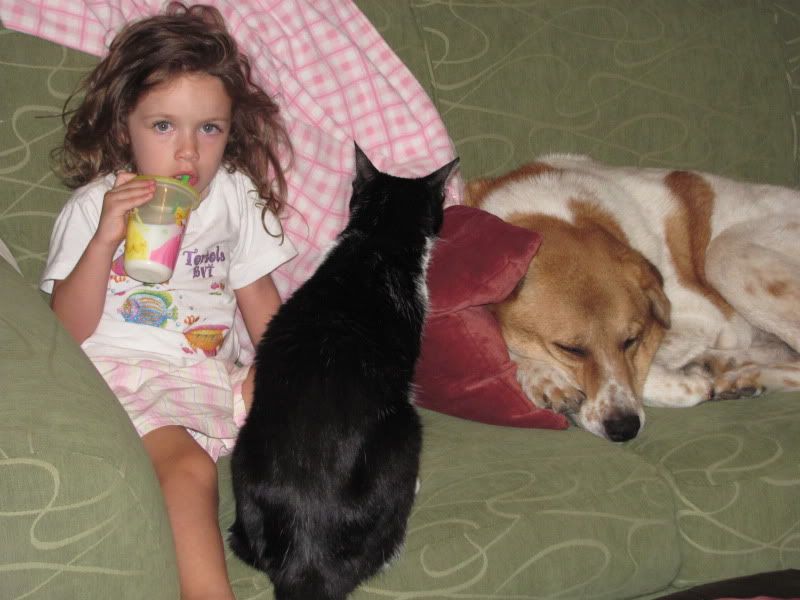 Charlie (or Charles as Havi calls him) HAS to be by her when ever she's sat still and Moo loves to be in the same room as her, just making sure she's OK. Story time before bed includes the whole family... fuzzies and all.